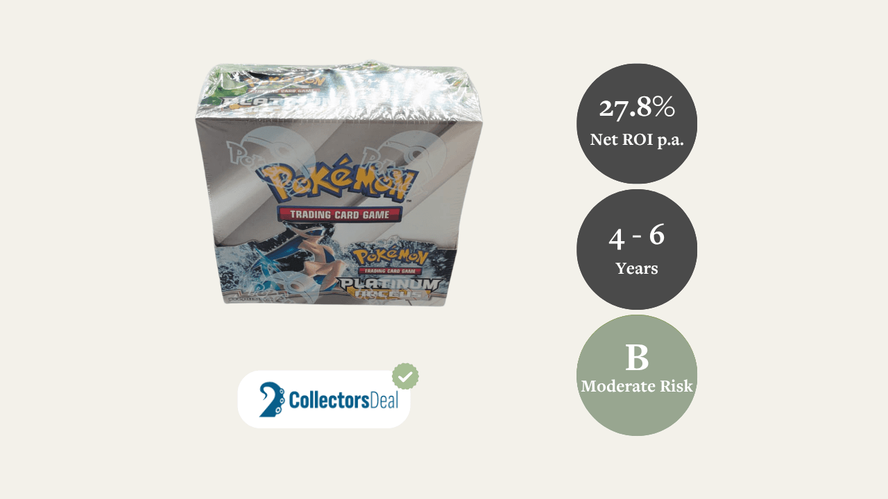 - 35.6% Netto-ROI p.a. (Ambitioniertes Szenario): Spiegelt ein stärkeres Aufwärtsszenario wider, das durch Seltenheit, Sammlerattraktivität und knappes Angebot an versiegelten Platinum Arceus Boxen unterstützt wird.
