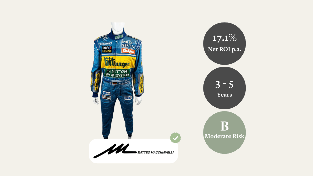 - 3–5-Jahres-Zeitrahmen: Zielt auf die Nachfrage von Sammlern ab, die durch Schumachers Vermächtnis und das weltweit steigende Interesse an F1-Rennmemorabilien angetrieben wird.