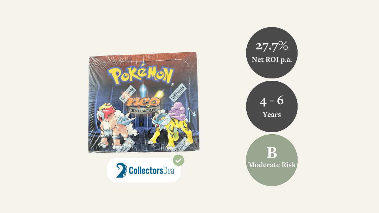 Aus Investitionssicht vereint Neo Revelation 1st Edition eine starke historische Preisdynamik mit einer klaren Knappheitserzählung. Mit nur begrenztem vergleichbarem Angebot auf dem freien Markt, einem validierten Fair-Value-Benchmark und einer anhaltenden Nachfrage nach ikonischen, versiegelten Vintage-Pokémon-Produkten sticht diese Anlage sowohl als kulturelles Relikt als auch als überzeugende Sammlerinvestition hervor.