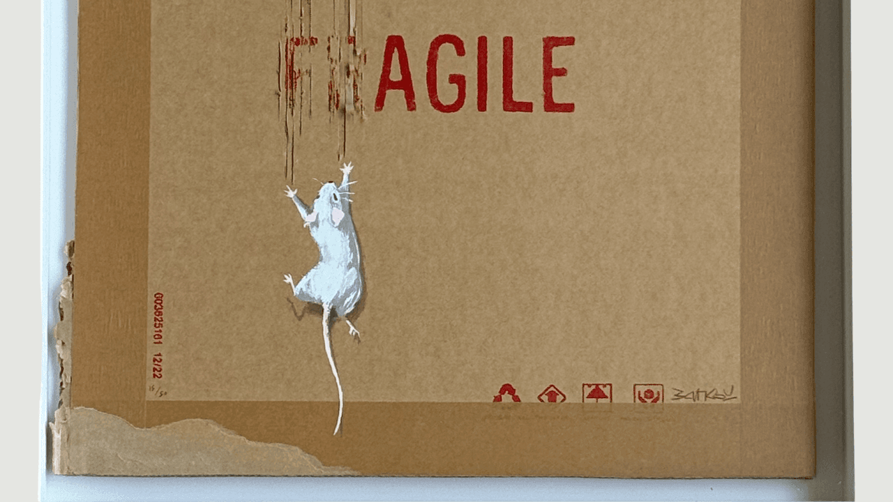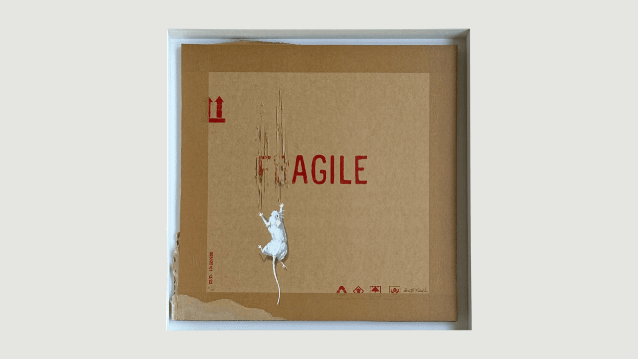Resilienz in Pappe 🐭: Banksys AGILE ist mehr als ein Sammlerstück – es ist ein Stück lebendiger Geschichte. Als Reaktion auf den Krieg in der Ukraine entstanden, verkörpert seine kühne Neuinterpretation von FRAGILE zu AGILE Hoffnung, Stärke und Widerstand. Jeder handgefertigte Druck erzählt eine einzigartige Geschichte, die vom Künstler selbst geprägt ist. Für diejenigen, die an die Kraft der Kunst glauben, die Wahrheit zu sagen, gegen Ungerechtigkeit zu protestieren und durchzuhalten, ist AGILE ein greifbares Symbol für diese Stimme.