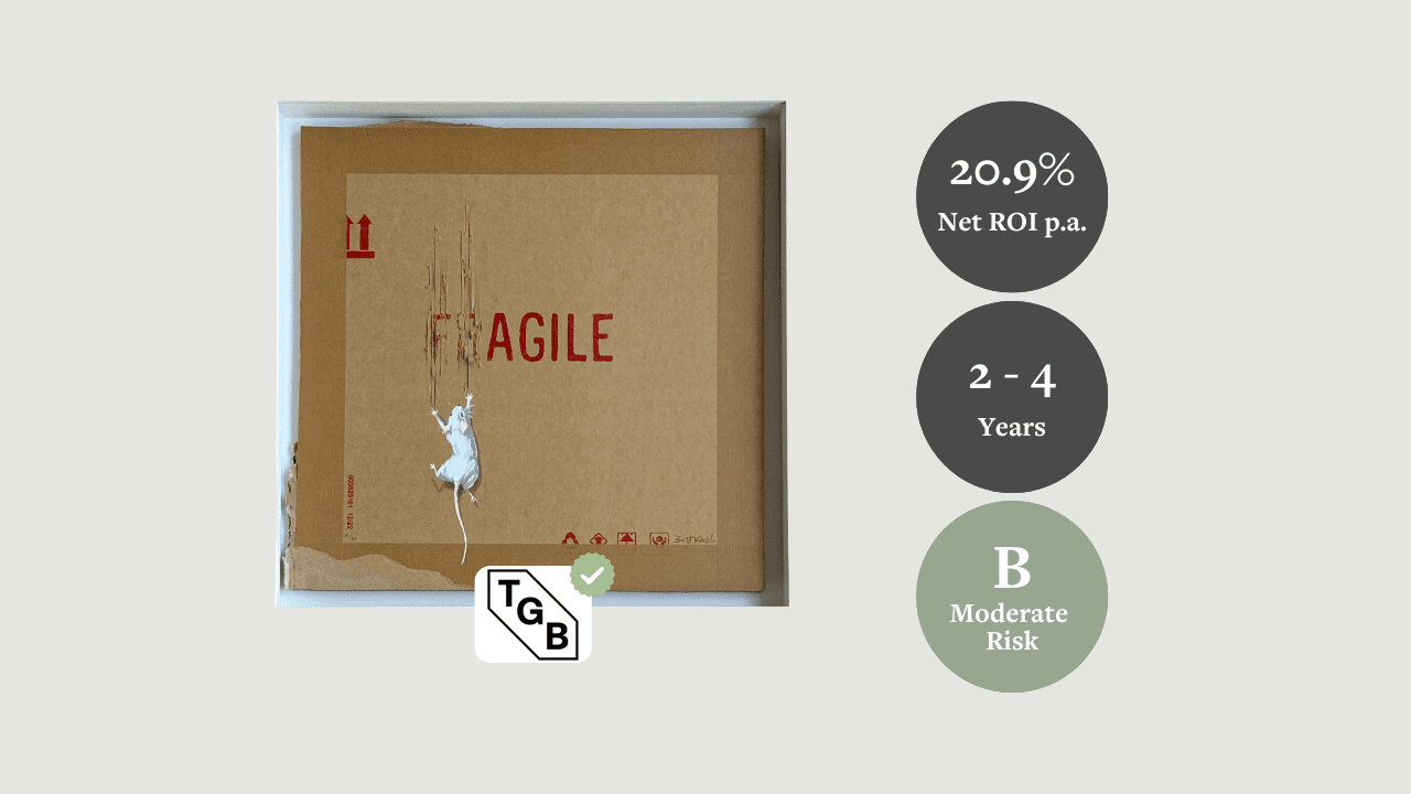 Dieser Druck hat sich bereits auf dem Auktionsmarkt bewährt, mit Preisen zwischen 40.000 und 80.000 Pfund, die in den letzten Jahren erzielt wurden. Die ausgewogene prognostizierte CAGR von 20,1 % über einen Zeitraum von drei Jahren basiert auf historischen Vergleichsdaten ähnlicher Banksy-Editionen (z. B. Jack and Jill, Rat Clock, Pulp Fiction), und der aktuelle Eintrag entspricht dem fairen Marktwert (87.359 € vor Gebühren). Dies deutet auf eine starke Wertbasis mit gesundem Aufwärtspotenzial hin, das durch die moderate Volatilität dieses Segments des Banksy-Marktes zusätzlich unterstützt wird.