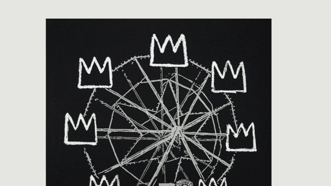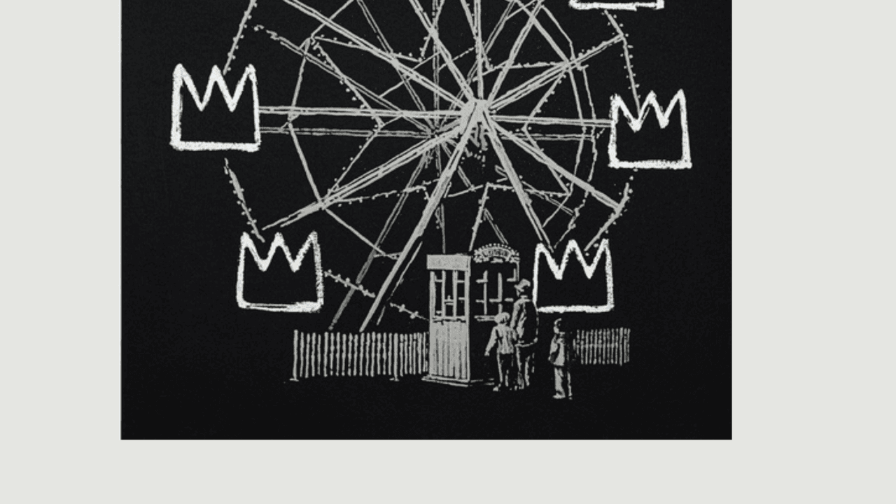 Banksquiat (Black), das 2019 in Banksys Pop-up-Store Gross Domestic Product veröffentlicht wurde, ist eine vielschichtige Hommage an Jean-Michel Basquiat – sowohl in der Bildsprache als auch in der ideologischen Spannung. Das zentrale Motiv, ein Riesenrad, das mit Basquiats ikonischen Kronen verziert ist, verweist auf Basquiats wiederkehrende Verwendung der Krone als Symbol für künstlerisches Genie und Königtum – insbesondere im Kontext der herausragenden Leistungen schwarzer Künstler. Indem Banksy dieses Symbol als Teil eines konsumorientierten Karussells neu interpretiert, liefert er eine satirische Kritik daran, wie Basquiats Vermächtnis auf dem heutigen Kunstmarkt kommerzialisiert wurde – endlos kreisend in Zyklen von Markenkooperationen, Merchandising und kommerzieller Überpräsenz.