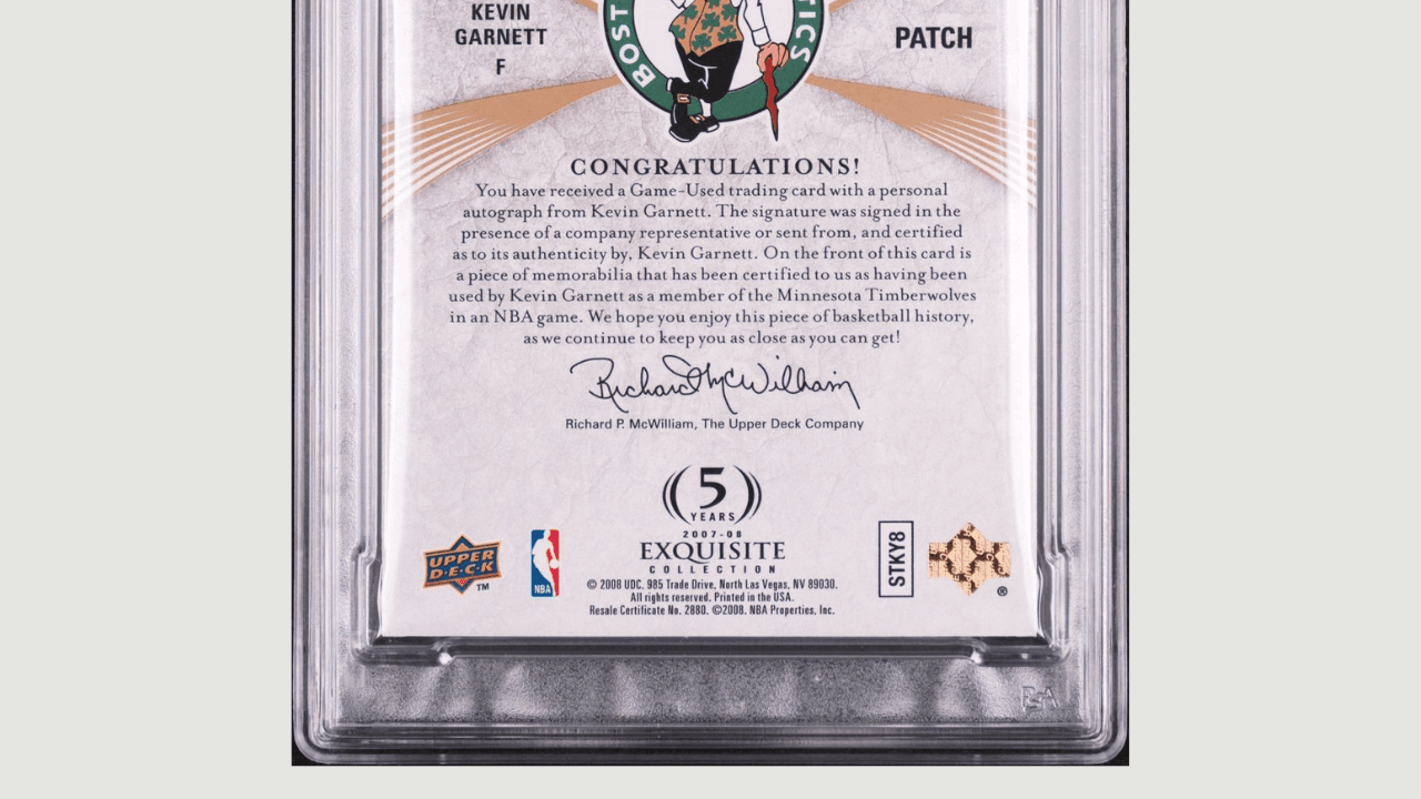 Die vorgestellte Garnett-Karte ist wohl die beste Karte seiner Karriere aus seiner Zeit bei den Celtics. Mit der Nummer 5/50 entspricht sie direkt seiner Trikotnummer und ist damit ein echtes âUnikatâ innerhalb der Auflage. Der Patch selbst ist nicht nur farbenfroh, sondern auch historisch: ein achtfarbiger Break aus dem All-Star-Spiel 2008 â symbolisch fĂŒr Garnetts Triumph ĂŒber Kobe Bryant wĂ€hrend ihres Aufeinandertreffens im NBA-Finale im selben Jahr. Das Produktionsjahr der Karte fĂ€llt zudem mit Garnetts einzigem Meistertitel und dem 5-jĂ€hrigen JubilĂ€um von Exquisite zusammen, was seiner Serien- und Trikotnummer entspricht und der Karte eine Symbolik verleiht, die bei Sport-SammlerstĂŒcken selten zu finden ist.