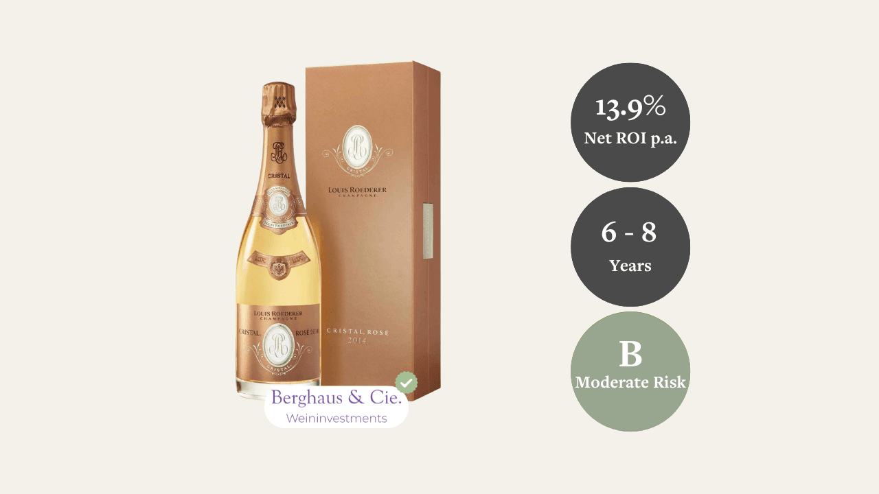 Cristal Rosé 2014 in Magnum vereint Referenzjahrgangsqualität, strukturelle Knappheit und transparente Marktpreise im Prestige-Champagner-Segment. Unterstützt durch starke jüngste Performance, eine lange Trinkreife und einen Einstiegspreis unterhalb der aktuellen Benchmarks bietet der Vermögenswert ein klar definiertes 6–8-jähriges Anlageprofil, das auf Markenstärke und disziplinierter Bewertung basiert.