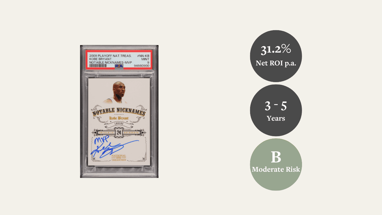 - 42,4% CAGR (optimistisch): Unterstützt durch die Seltenheit der Widmungen, den Jersey-Number-Aufschlag und die zunehmende Fokussierung auf erstklassige Kobe-Sammlerstücke.