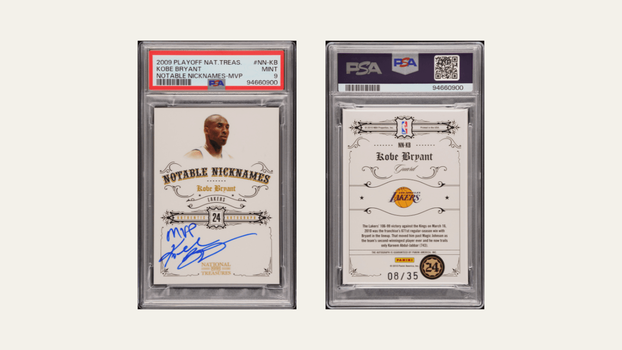 Diese Karte steht für einen entscheidenden Moment sowohl in der Karriere von Kobe Bryant als auch in der NBA-Geschichte von Panini. Sie kam 2009–10 raus und ist Teil von Paninis erstem National Treasures NBA-Set, dem Produkt, das die Marke als Marktführer für hochwertige Basketballkarten etabliert hat. Die Untergruppe „Notable Nicknames” brachte das erste vertikale Beschriftungsdesign in diesem Hobby raus, und diese MVP-Version ist auf nur 35 Exemplare weltweit limitiert.