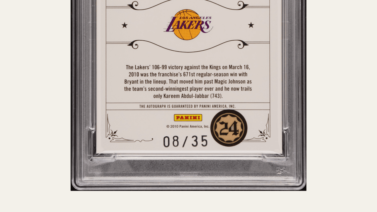 Da Kobe Bryant als einer der kulturell bedeutendsten Sportler seiner Generation fest etabliert ist, steigt die Nachfrage nach seinen wichtigsten Karten aus der Panini-Ära weiter an. Da sich Sammler zunehmend auf frühe National Treasures-Autogramme mit Widmungen und niedrigen Seriennummern konzentrieren, steht diese Karte an der Schnittstelle zwischen Seltenheit, Narrativ und langfristiger Attraktivität.
