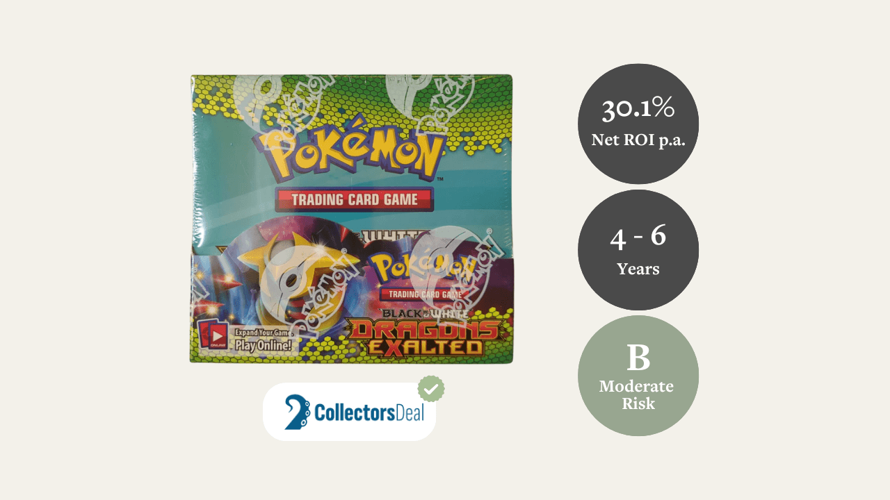 In den letzten zehn Jahren haben Dragons Exalted-Boxen eine kumulative CAGR von über 100 % erzielt, unterstützt durch eine weltweit steigende Nachfrage nach versiegelten, authentischen Pokémon-Sammlerstücken. Allein zwischen Juni 2023 und Oktober 2025 erzielten vergleichbare Verkäufe eine Wertsteigerung von 108,7 %, was das robuste mittelfristige Potenzial dieser Ära unterstreicht. Unser konservatives Modell wendet nur 30 % dieser historischen CAGR an und erzielt eine ausgewogene erwartete Rendite von 30,1 % pro Jahr nach Abzug der Gebühren.
