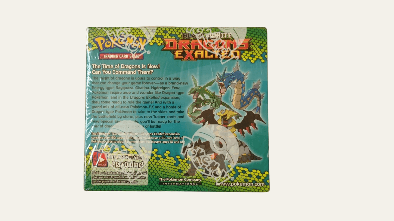 Die Herrschaft der Drachen 🐉: Sammler beschreiben Dragons Exalted oft als die spirituelle Brücke zwischen der frühen Blütezeit von Pokémon und seiner modernen Renaissance. Seine versiegelte Form fängt eine Zeit ein, in der die Auflagen geringer waren, die Nachfrage stieg und die Begeisterung für Karten vom Typ Drache ihren Höhepunkt erreichte – was es zu einem wahren Symbol für zeitlosen Wert macht.