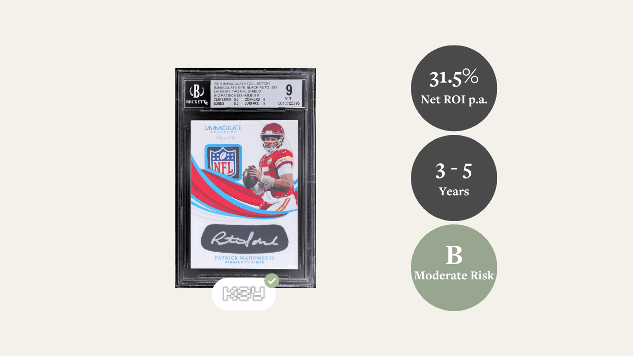 Die Karriere von Mahomes fügt zusätzliche Überzeugungskraft hinzu: drei Meisterschaften, mehrere MVP-Titel und eine aussergewöhnliche Playoff-Performance prägen eine klare GOAT-Narrative. Mit einer erwarteten Rendite von 31,5% pro Jahr und starkem Abwärtsrisikoschutz laut VaR-Modell stellt diese Karte eine hochgradig überzeugende, datenbasierte Investmentgelegenheit dar.
