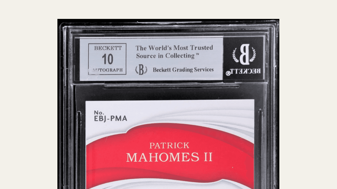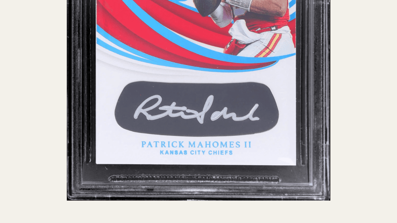 Mahomes' charakteristischer 1/1-Shield-Autogramm: Ein einzigartiger Shield-Autogramm aus Mahomes' erster Meisterschaftssaison ist ein seltenes Stück Sportgeschichte. Die vollständige Unterschrift, die silberne Tinte und das vertikale Shield-Layout machen ihn sofort zu einer Ikone. Da es nur ein einziges Exemplar gibt, fängt diese Karte einen entscheidenden Moment im modernen Football ein und bietet Investoren einen greifbaren Anteil an Mahomes' Vermächtnis.