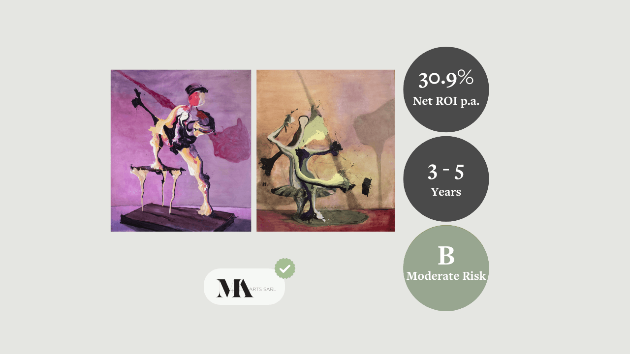 - 30.9% net ROI p.a. (balanced): Based on a 70% probability of repeating the CAGR observed in artists like Móyòsoré Martins (2019–2025).