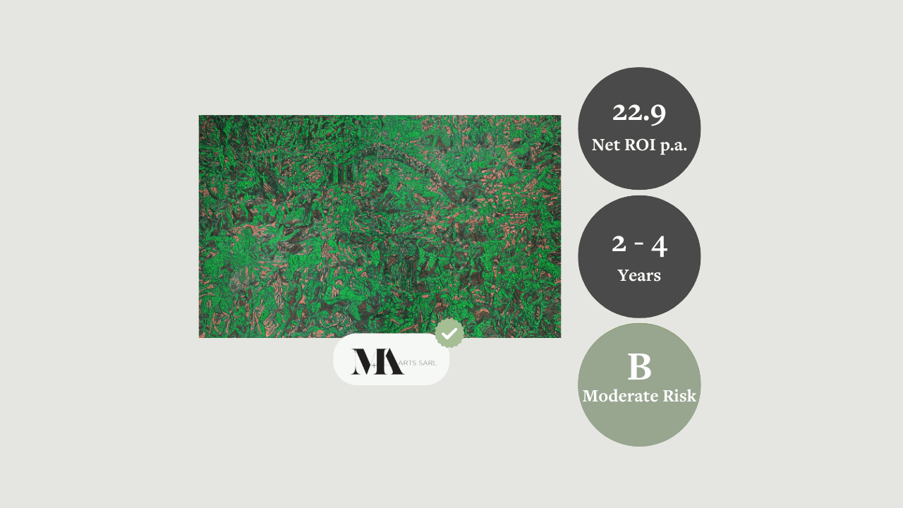 - 26.2% Net ROI p.a. (Ambitious): Based on an 95% probability of replicating the 21.0% CAGR observed across comparable âMythosâ works since 2022. These potential returns over the next four years, under both the balanced and ambitious scenarios, are further enhanced by the 28.1% discount at which the painting is offered compared to the current gallery price for comparable paintings (111 x 180 cm) from the âMythosâ series.
