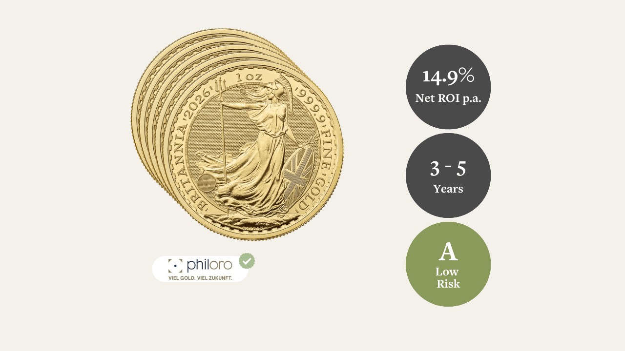 The Britannia gold coin offers tax advantages, high purity, international tradability and modern security features. Combined with an attractive risk-return profile, it offers investors a robust, liquid and proven hedging strategy for times of economic uncertainty and long-term asset protection.
