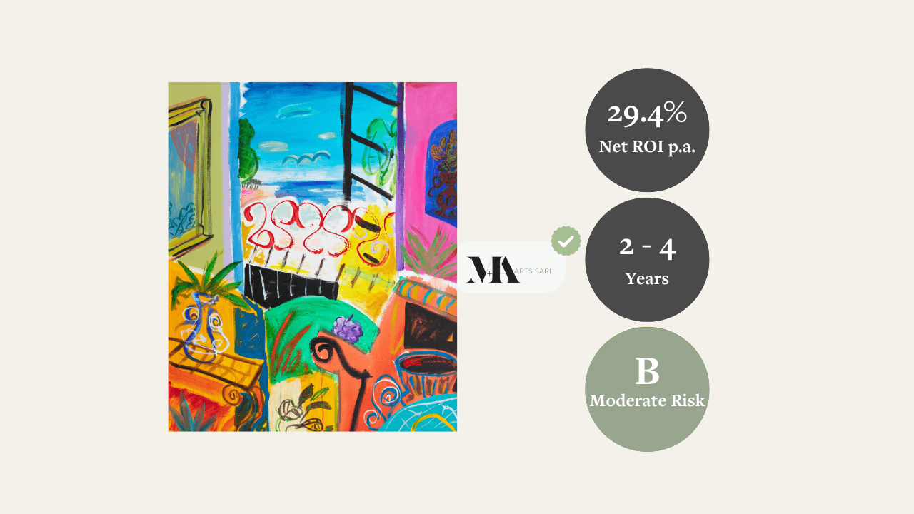 Mediterranean Studio offers a rare chance to acquire a museum-grade piece at fair market price, backed by strong institutional interest and gallery validation. With projected double-digit returns and a compelling emotional narrative, it stands out as a well-balanced, data-supported opportunity in the contemporary art segment.