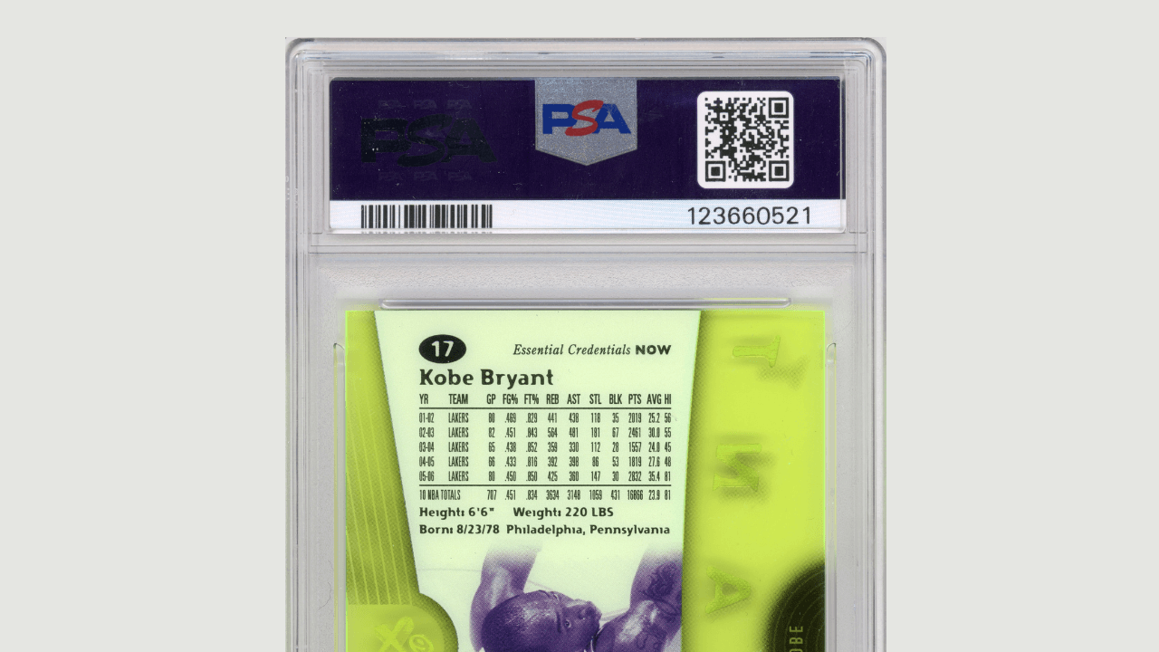 The card is also market-fresh, meaning it has not circulated publicly — a trait highly valued because it implies it has not been repeatedly sold or exposed to prior handling. Recent market behavior indicates increasing demand for serial-numbered, low-population Kobe inserts, particularly those with historical relevance and clear design significance. Essential Credentials has seen rising collector adoption, reinforced by major private collectors owning high-end examples and Michael Jordan Essential Credentials sales establishing new benchmarks.