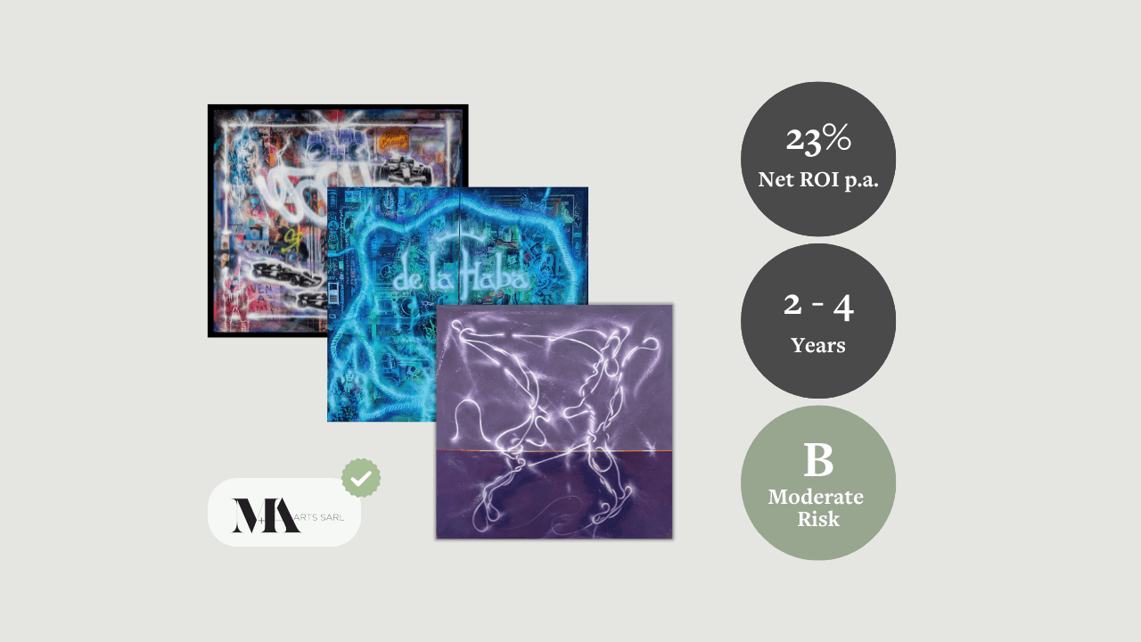 This Gregory de la Haba trio combines strong recent price growth, a 20% gallery discount and rising institutional recognition. Investors gain exposure to three flagship pieces at once, with clear medium-term return potential and controlled risk. It is a focused way to back an emerging contemporary artist at a formative stage.