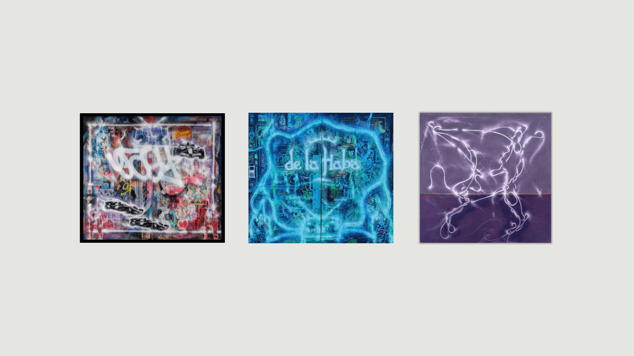 One of the paintings is from the “Easy Suite” series, begun in 2024; another is part of the “Locus Of Being” series, which de la Haba launched in 2025; and the third comes from his most recent series, “In The Name Of”.