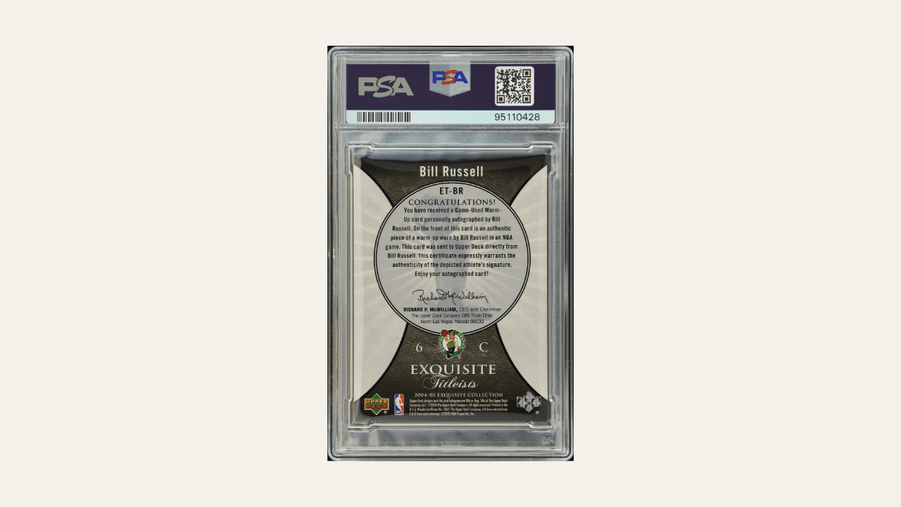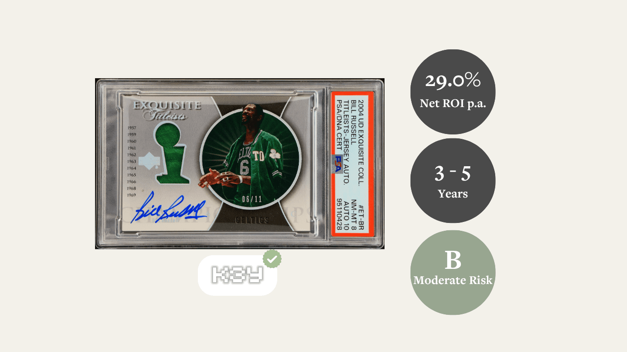 This rare Bill Russell 2004 Exquisite is the only jersey-numbered copy of the NBA’s most decorated player, combining elite provenance, extreme scarcity, and strong growth potential—enhanced by a 24.2% entry discount.