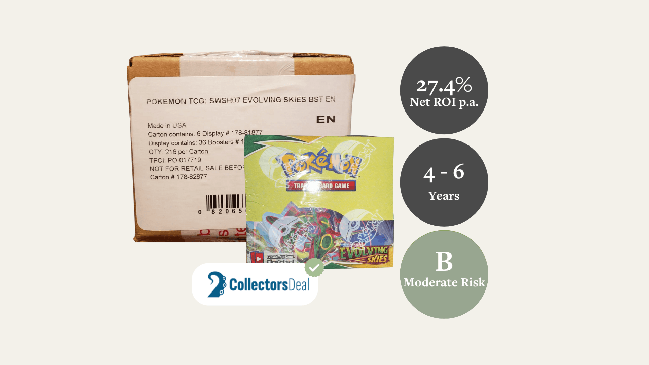 The sealed Evolving Skies case combines rarity, strong historical growth, and deep collector appeal. With steady demand, limited supply, and top-tier chase cards, it stands out as a resilient long-term item. Its performance across multiple market cycles supports a compelling outlook for collectors seeking both enjoyment and appreciation potential.