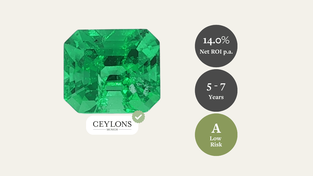 - Horizon de 5 à 7 ans : aligné sur les périodes de détention historiques des émeraudes de haute qualité pour les cycles d'appréciation et de liquidité.