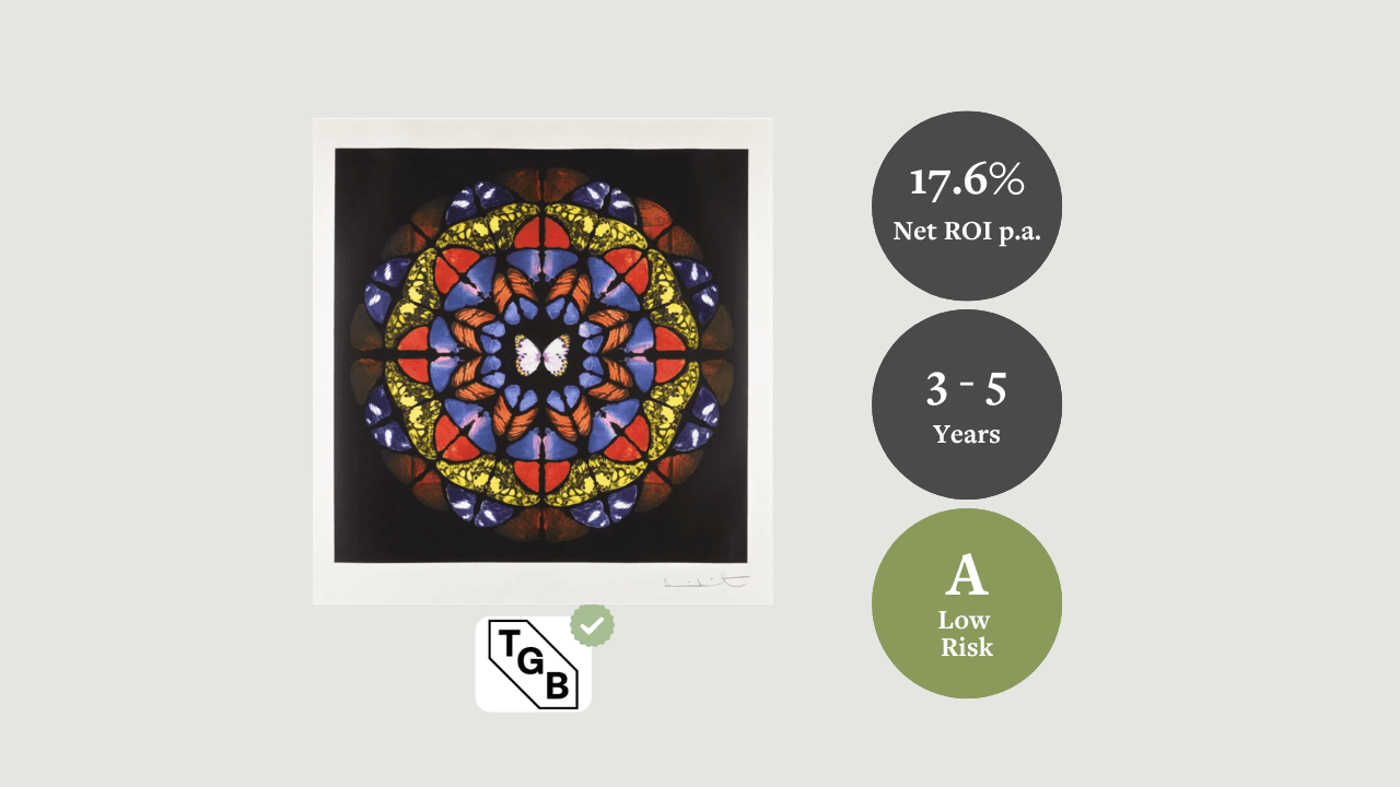 - 20,8 % de retour sur investissement net par an (ambitieux) : suppose une probabilité d'environ 100 % de reproduire le TCAC historique de 19,3 %, soutenu par la demande continue pour les œuvres de papillons de Hirst.