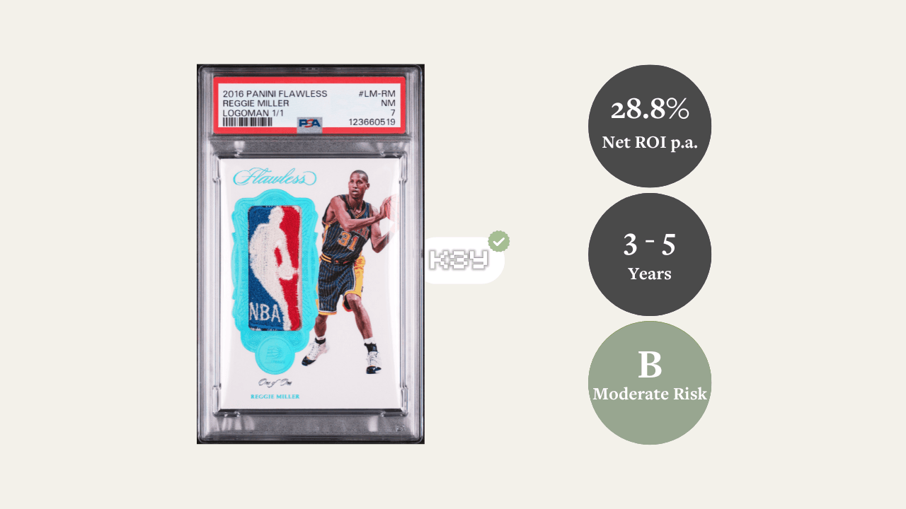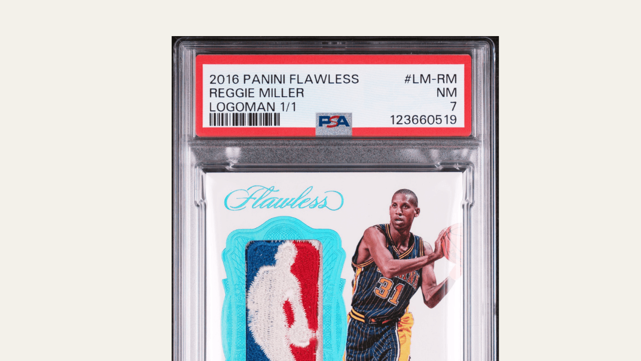 Cette carte a un attrait unique qui dépasse les catégories. Elle est recherchée non seulement par les fans de Reggie Miller et les collectionneurs des Indiana Pacers, mais aussi par les collectionneurs Flawless, les passionnés de logoman et ceux qui constituent des collections uniques ou sur le thème des finales. Avec seulement neuf cartes solo Reggie logoman connues pour toutes les années et tous les fabricants, et aucune jamais vendue publiquement, cette carte offre une rareté et un prestige dignes d'un musée.Le patch logoman utilisé pendant le match et la note PSA 7 (sur un papier épais Flawless de 130 pt) ajoutent à son attrait. Vu l'exclusivité de la carte et sa sensibilité à l'état, la note est plus qu'acceptable, surtout que les collectionneurs privilégient de plus en plus l'unicité et la provenance plutôt que la seule note numérique.