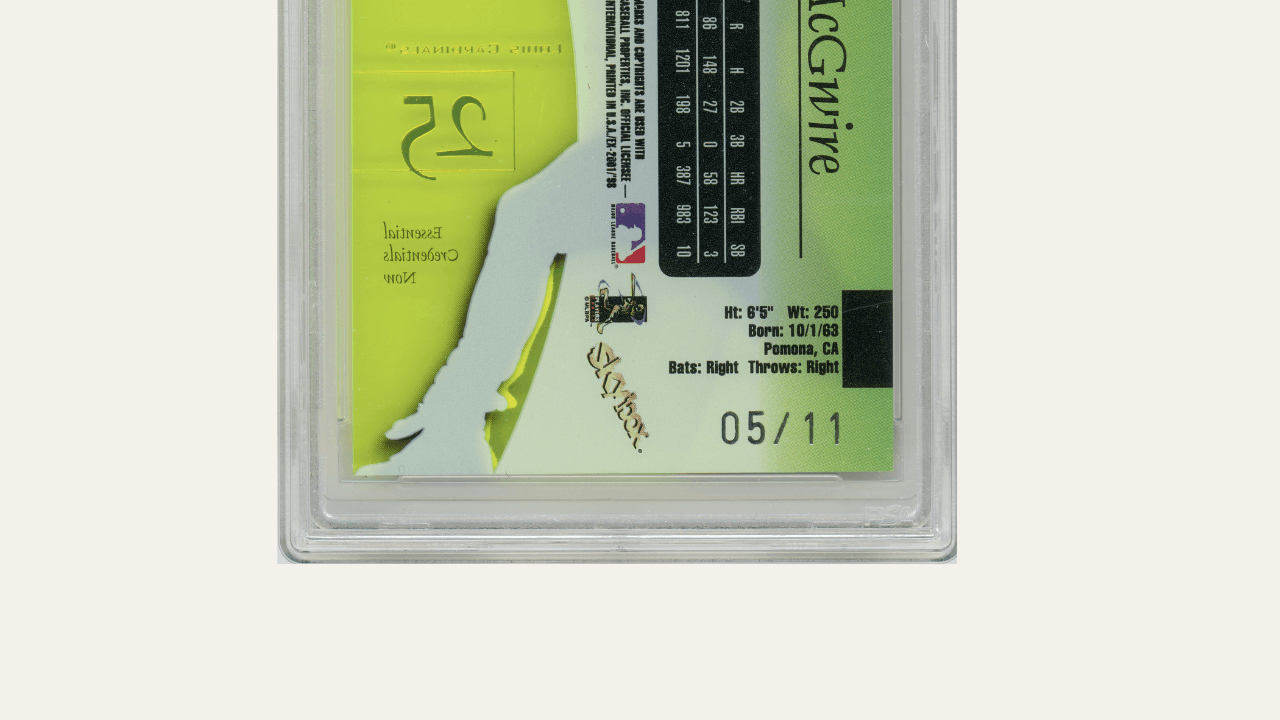 L'importance historique de cette carte est soulignĂ©e par la pertinence commerciale durable de McGwire. Sa 70e balle de home run de la mĂȘme saison s'est vendue 3 millions de dollars en 1999, ce qui en fait l'un des souvenirs sportifs les plus chers jamais vendus, consolidant ainsi sa place parmi les lĂ©gendes du baseball. Des cartes Essential Credentials comparables d'athlĂštes de mĂȘme niveau, tels que Ken Griffey Jr. ou Michael Jordan, ont atteint des valeurs comprises entre 200 000 et plus de 3 millions de dollars, soulignant encore davantage le potentiel de cet objet de collection extrĂȘmement rare.