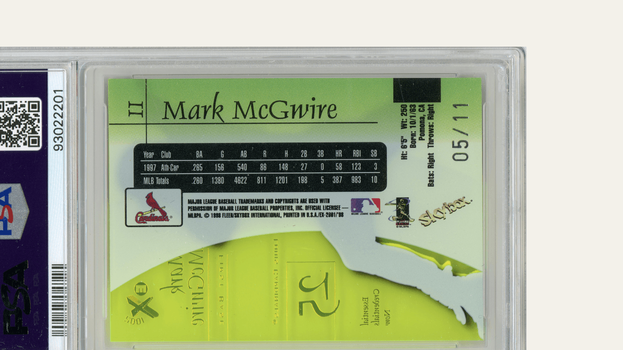 Pour les investisseurs, la carte McGwire /11 reprĂ©sente une combinaison de raretĂ©, d'histoire et de prestige â un objet culturel qui incarne l'esprit de toute une Ă©poque sportive tout en offrant un fort potentiel d'apprĂ©ciation Ă long terme.