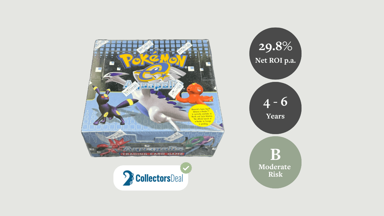 La boîte de boosters Pokémon Aquapolis est à la fois un objet de collection historique rare et une opportunité étayée par des données. Avec ses solides antécédents, son prix d'entrée équitable, sa protection robuste contre la baisse et son rendement annualisé prévu à deux chiffres, elle reste l'un des rares présentoirs scellés combinant rareté, nostalgie et performances de marché vérifiables dans un cadre de risque équilibré.