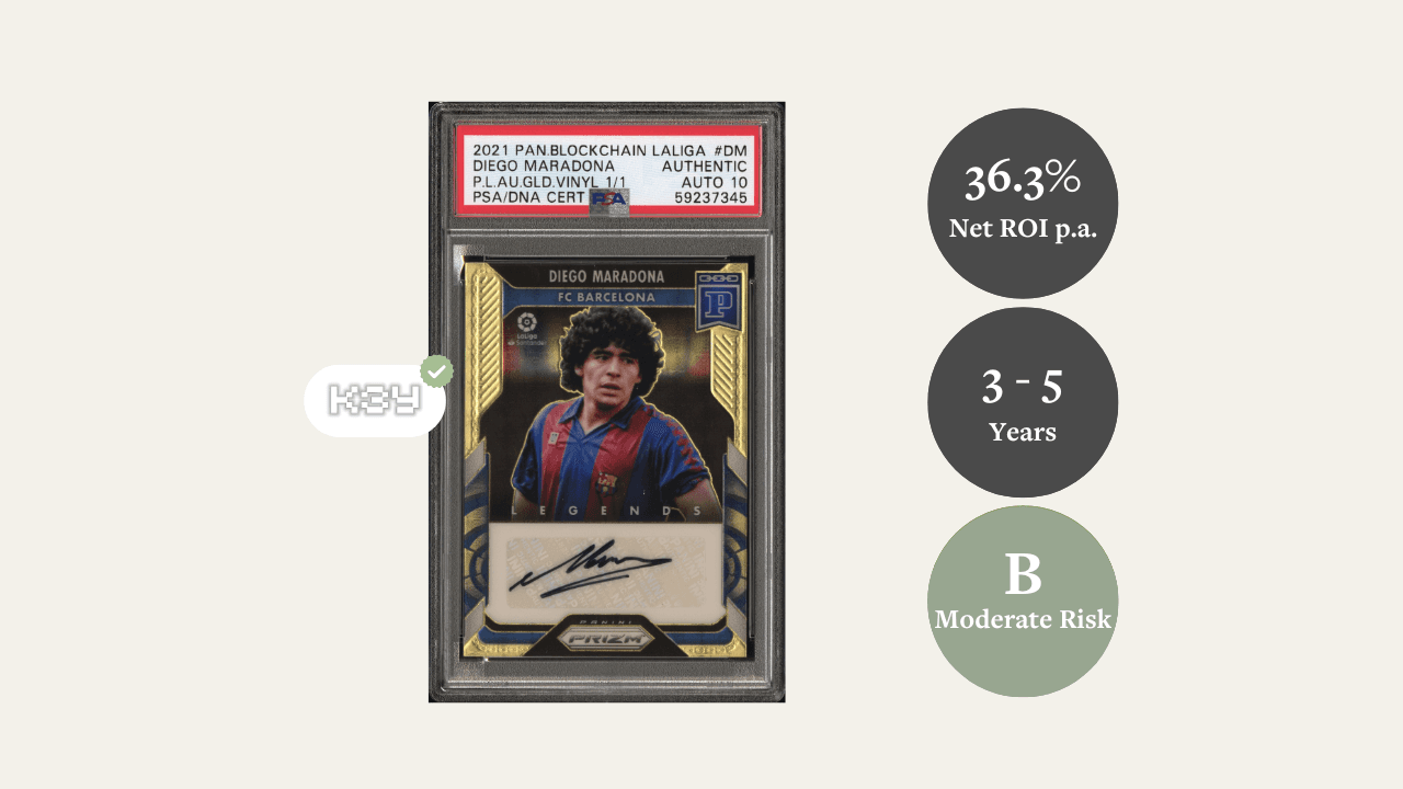 - 47.0% CAGR (optimistic): Derived from a 30.0% probability of achieving the historical 174% CAGR for high end Maradona cards based on the Maradona CardLadder player index as well as the 1/1 Auto Eminence card price increase (both 50% weighting).