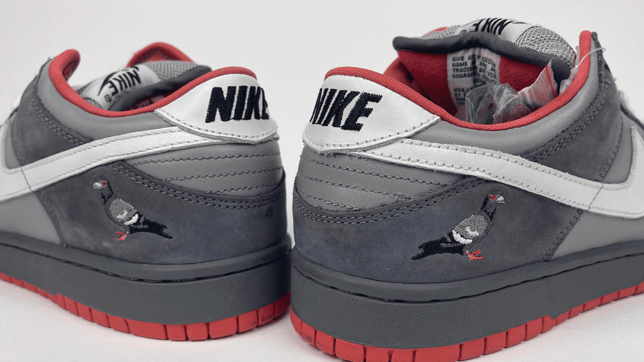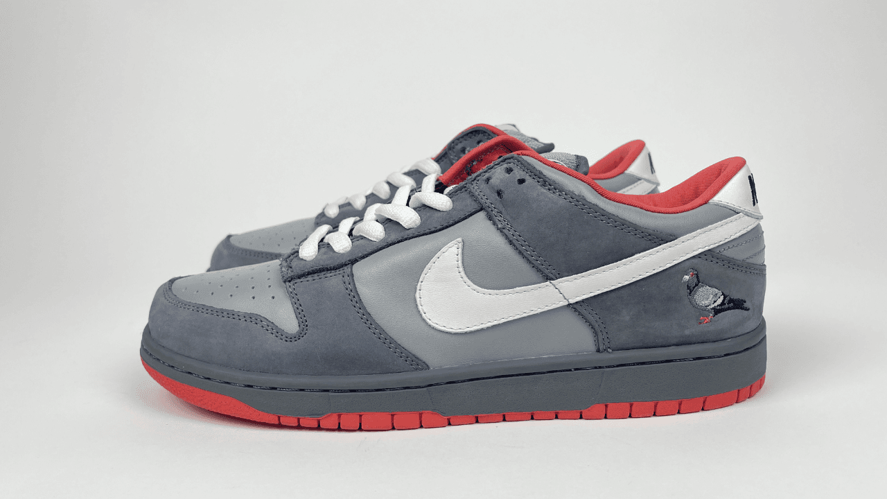 The Nike SB Dunk Low Pigeon was designed in 2005 in collaboration with New York designer and founder of urban clothing brand Staple Design, Jeff Staple. The design is inspired by the pigeons that are ubiquitous in New York City. The shoe's colors (gray, white, black, and a striking salmon pink accent) reflect the colors of an urban pigeon. On the heel of the shoe, there is an embroidered Pigeon logo, which has become the iconic mark of the model.